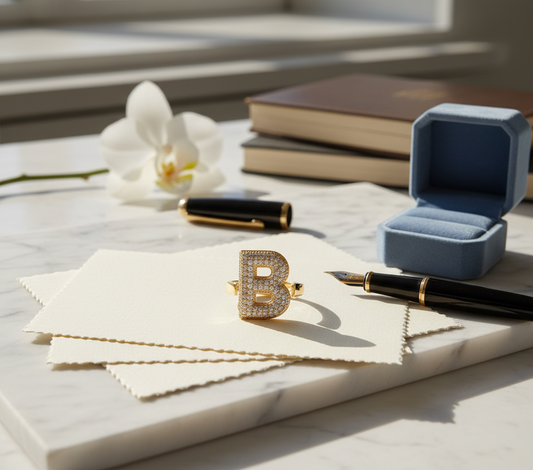 Anello color Oro con Iniziale in Acciaio Inox e Zirconi - Regolabile