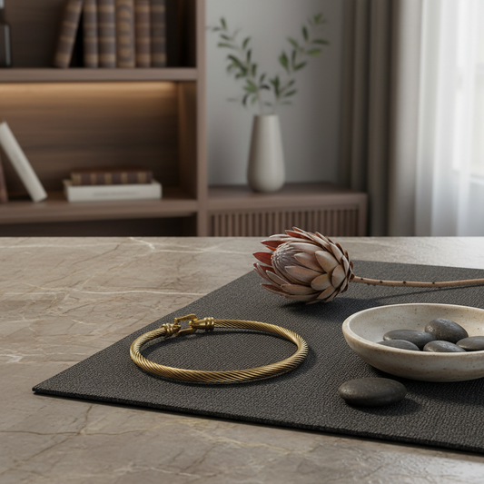 Ogni pezzo è fatto a mano in Europa con un design eco-luxury che combina texture naturali e finiture premium. Per l'uomo moderno che sceglie stile, qualità e sostenibilità.