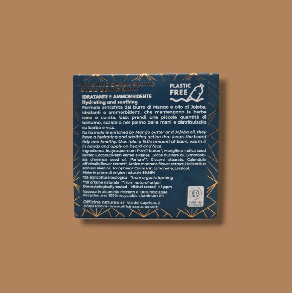 È un balsamo per barba lunga, certificato COSMOS, che ha l’aspetto di un burro estremamente idratante. Questa proprietà appartiene al burro di Mango, che non solo idrata la barba, evitando che si secchi, ma è anche emolliente e calmante in caso di pelle irritata. Se nel web i blog ti suggeriscono olio o balsamo per barba, col nostro balsamo, ti troverai bene, perché fra gli ingredienti trovi anche l’olio di Calendula, che agisce limitando le irritazioni e il prurito, e l’olio di Jojoba, che contribuisce a liberare i follicoli piliferi dall’eccesso di sebo. Di quest’ultimo si conosce la grande utilità sulla pelle sensibile o addirittura infiammata o lesionata.