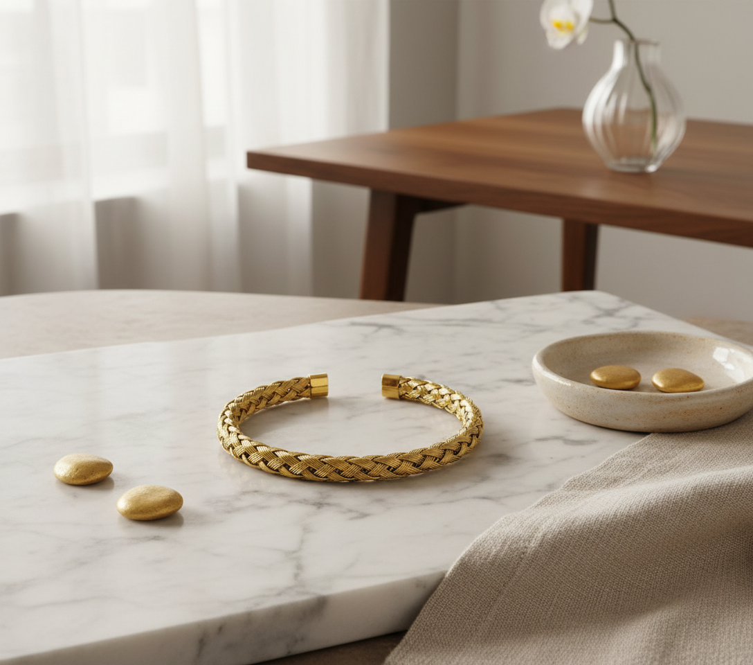 Questo bracciale rigido unisce l'eleganza del design intrecciato alla praticità dell'acciaio inox. La finitura color oro dona un aspetto prezioso senza il costo dell'oro vero, mentre la struttura rigida garantisce una vestibilità perfetta e confortevole tutto il giorno.