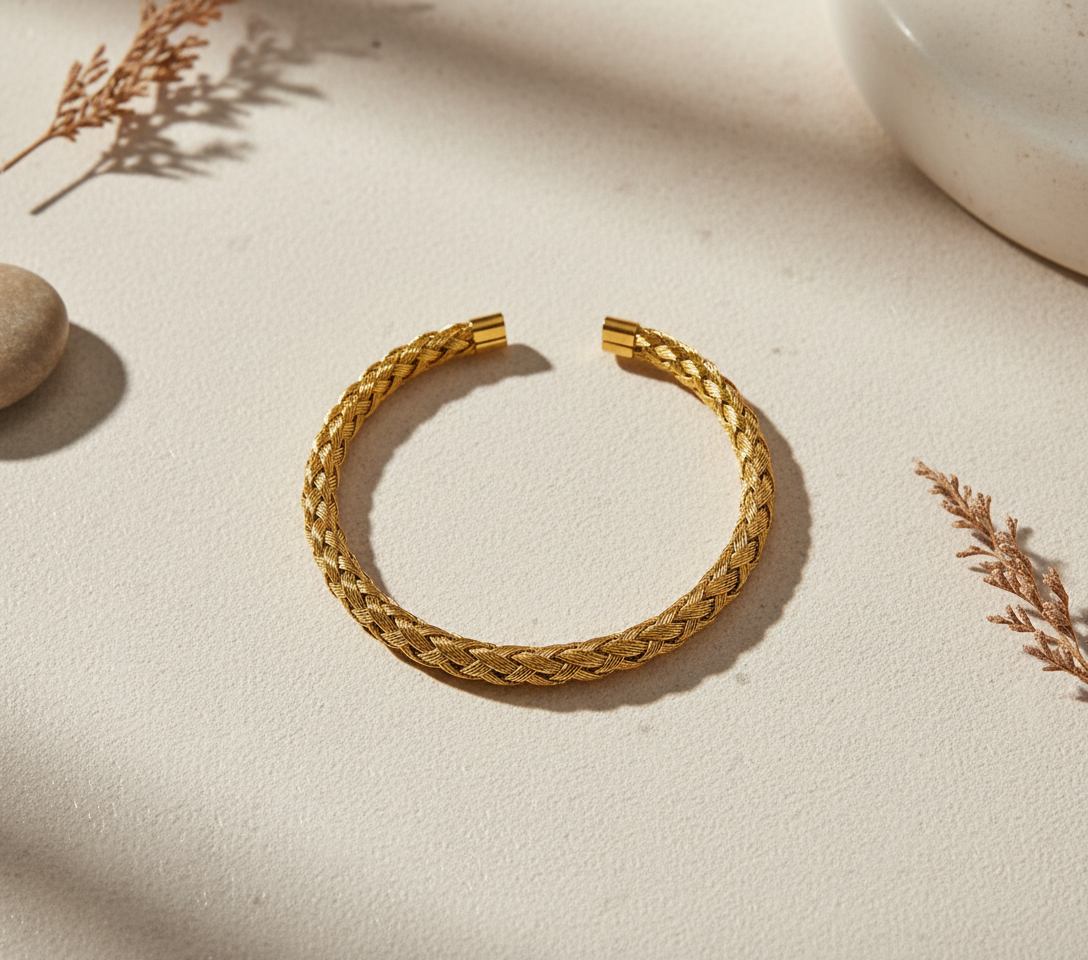 Eleva il tuo stile con questo raffinato bracciale rigido intrecciato in acciaio inox con finitura color oro. Un gioiello versatile e senza tempo, perfetto sia per lui che per lei.