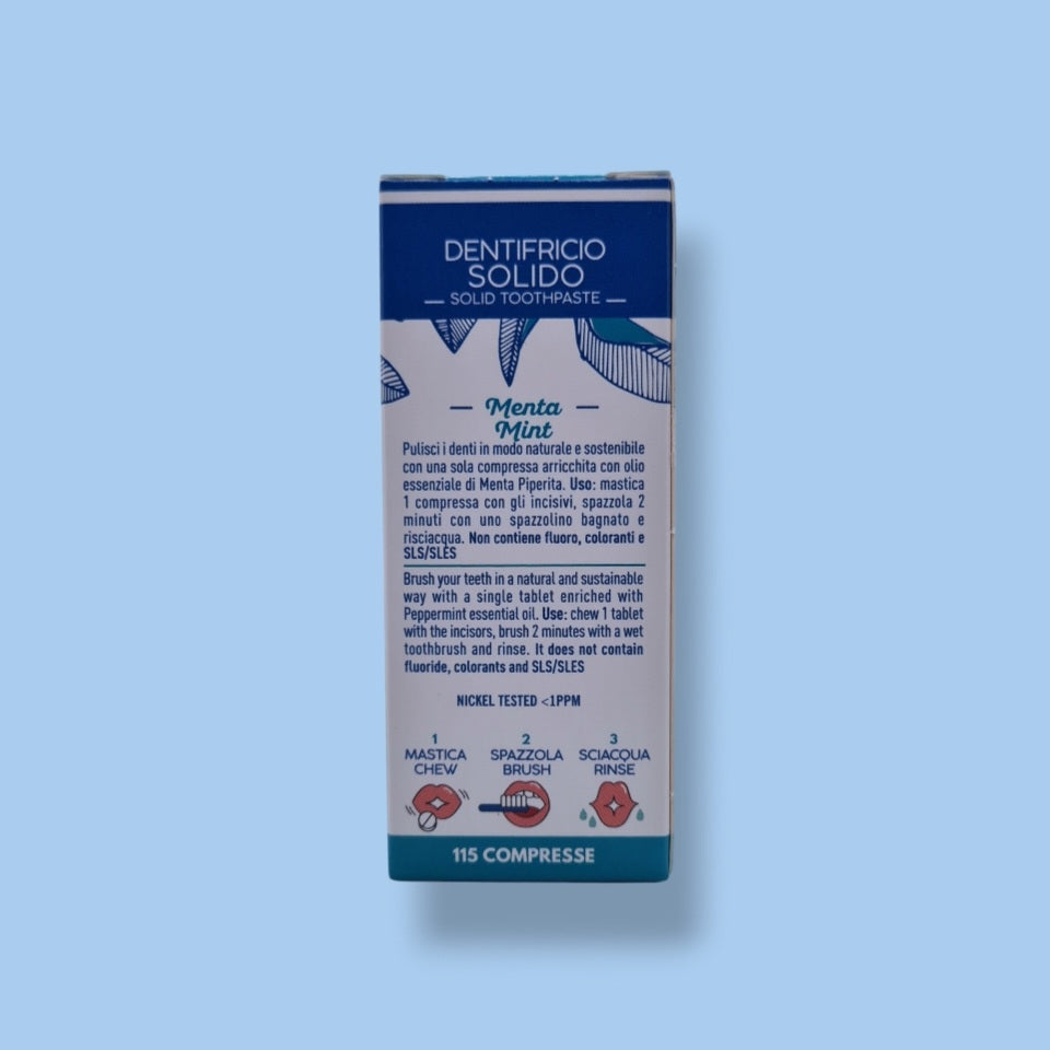 Questo permette di avere una formula priva di fluoro, come lo sono anche le formule dei nostri dentifrici in gel. Allo stesso modo, nella formula non abbiamo utilizzato coloranti e SLS/SLES, per avere un dentifricio pastiglie completamente sostenibile