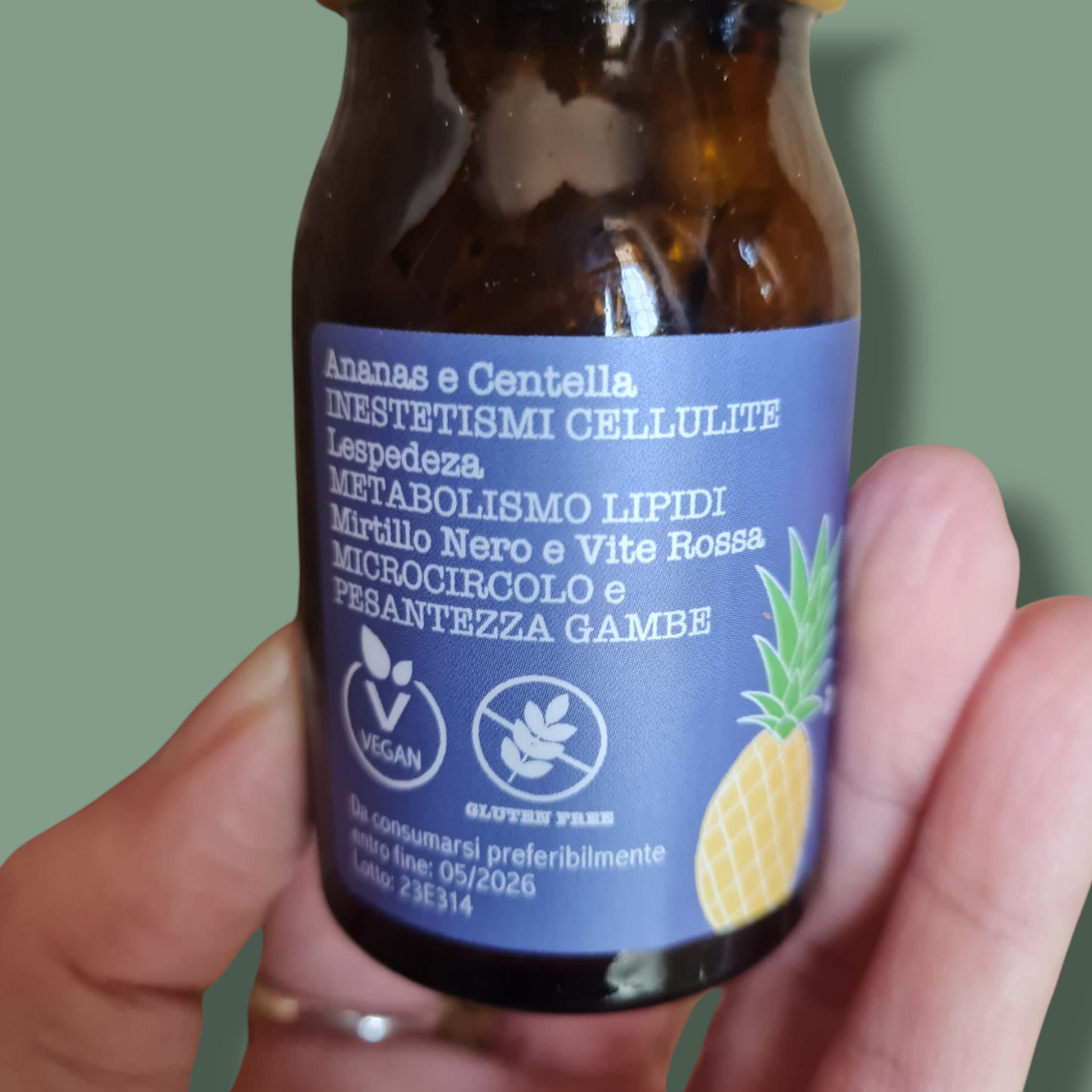 Ingredienti: Ananas gambo (Ananas comosus (L.) Merr.) polvere 250 GDU, Centella asiatica parti aeree (Centella asiatica (L.) Urb.) estratto secco al 20% derivati triterpenici, agente di rivestimento: capsula vegetale in idrossipropilmetilcellulosa; Bromelina 2500 GDU, Lespedeza parti aeree (Lespedeza capitata Michx.) estratto secco al 4% in flavonoidi totali espressi come rutina, Pilosella parti aeree (Hieracium pilosella L.) estratto secco al 1% vitexina, mirtillo nero frutti (Vaccinium myrtillus L.) estratto secco al 4% antocianine, vite rossa foglie (Vitis vinifera L.) estratto secco al 5% polifenoli, agenti antiagglomeranti: sali di magnesio degli acidi grassi e biossido di silicio