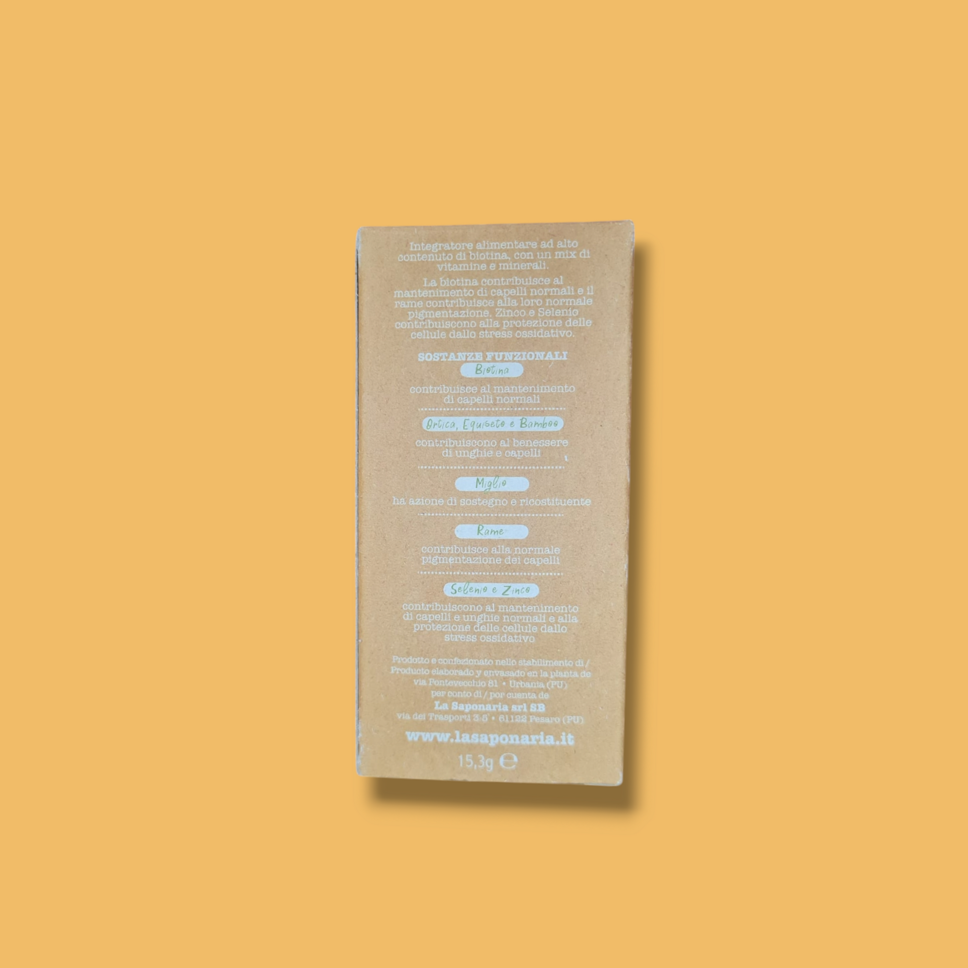 Hair Vitamin è un integratore alimentare ad alto contenuto di biotina, con un mix di vitamine e minerali. La biotina contribuisce al mantenimento di capelli normali e il rame contribuisce alla loro normale pigmentazione. Zinco e Selenio contribuiscono alla protezione delle cellule dallo stress ossidativo.
