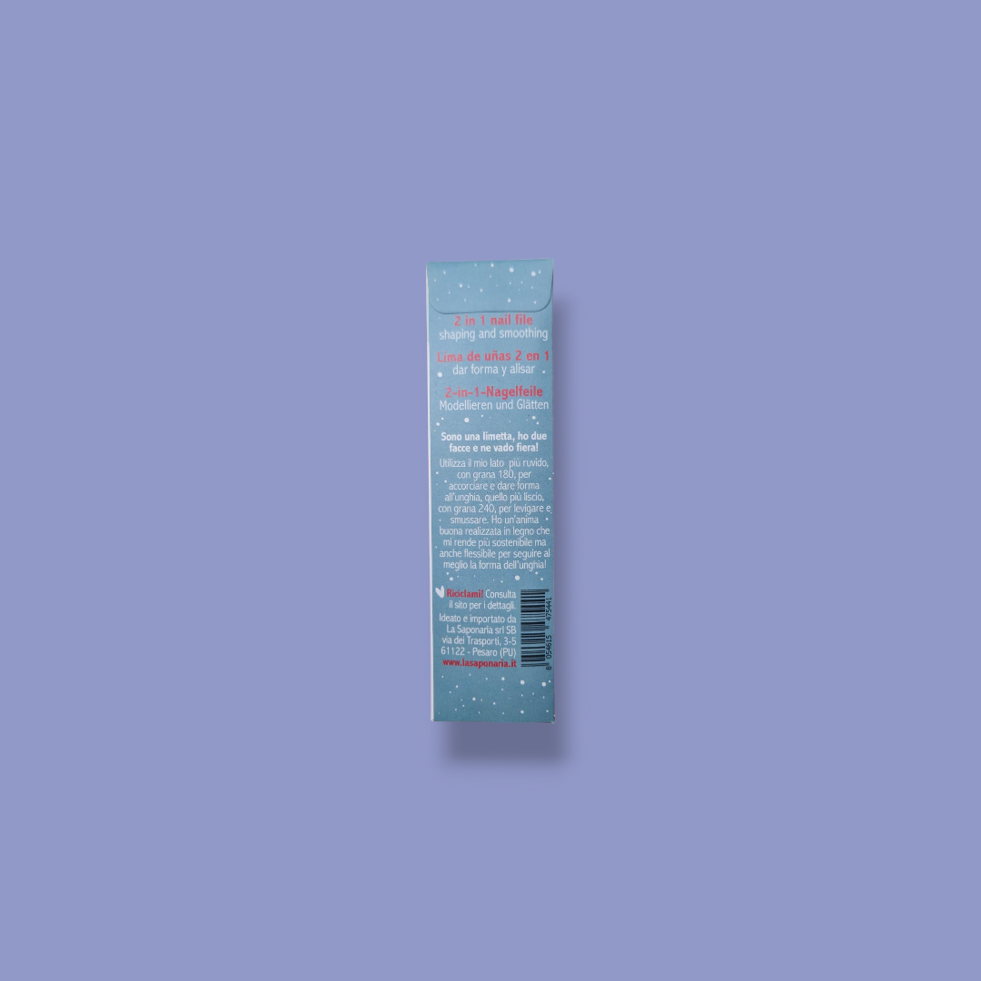 Utilizza il mio lato più ruvido, con grana 180, per accorciare e dare forma all’unghia, quello più liscio, con grana 240, per levigare e smussare. Ho un’anima buona realizzata in legno che mi rende più sostenibile ma anche flessibile per seguire al meglio la forma dell’unghia!