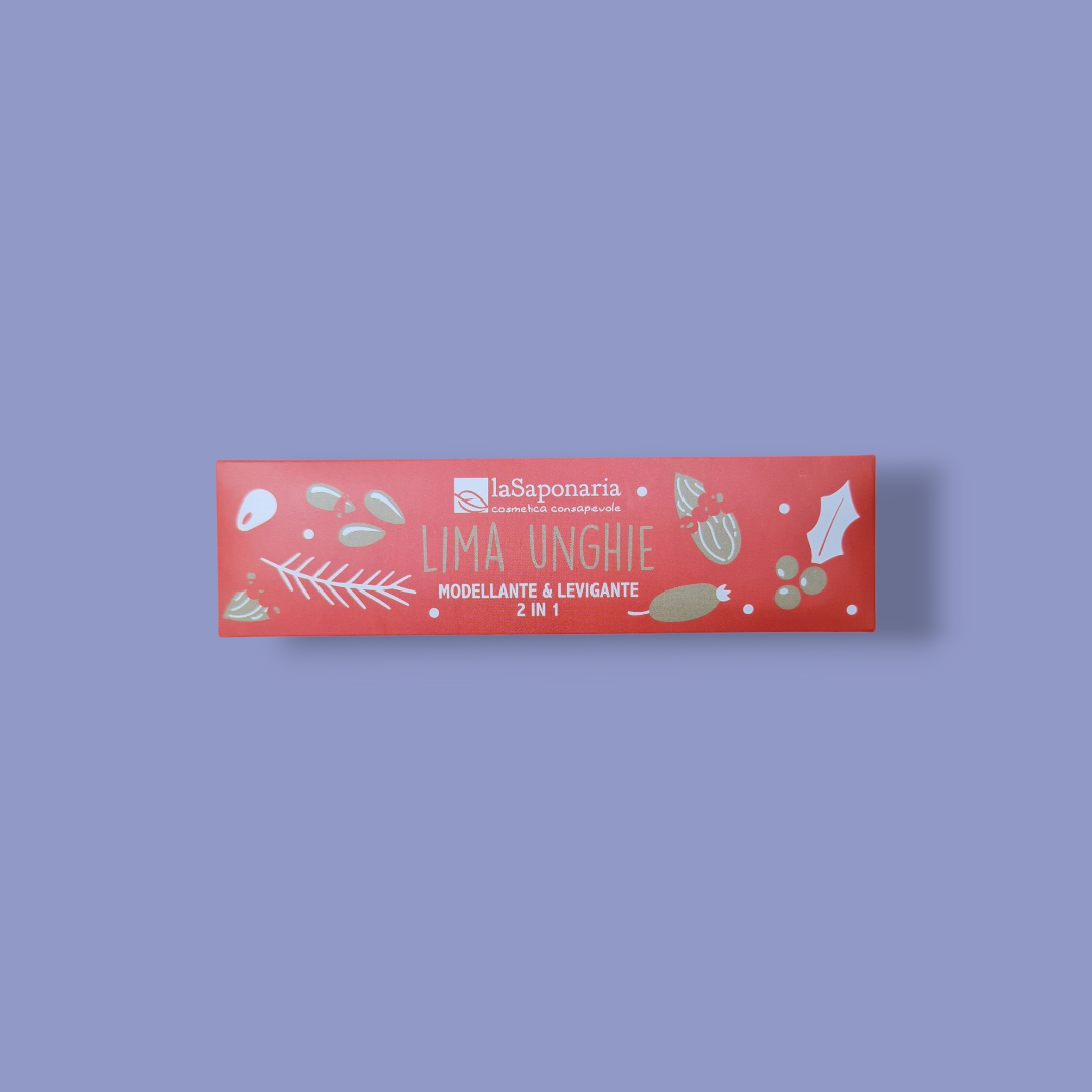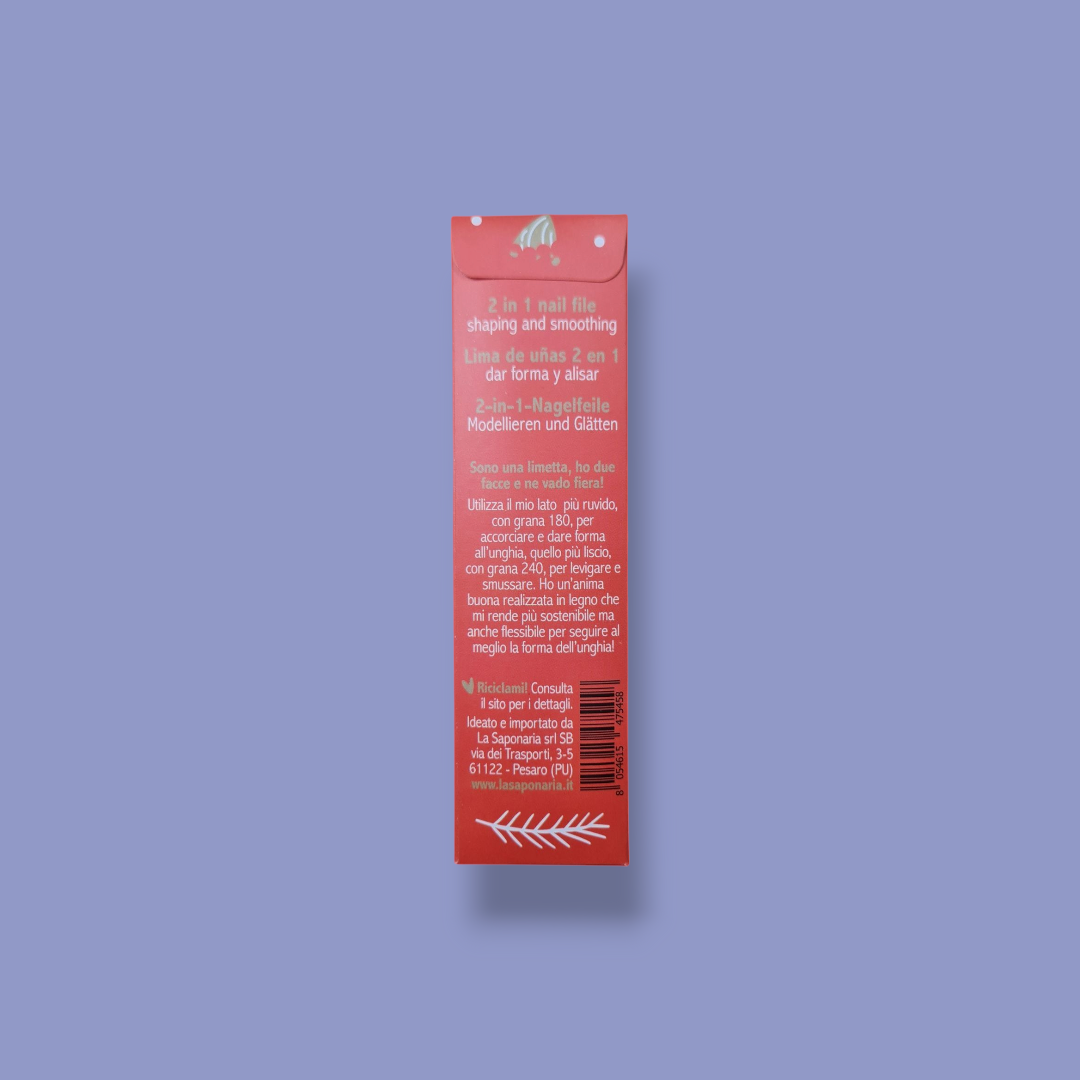 Utilizza il mio lato più ruvido, con grana 180, per accorciare e dare forma all’unghia, quello più liscio, con grana 240, per levigare e smussare. Ho un’anima buona realizzata in legno che mi rende più sostenibile ma anche flessibile per seguire al meglio la forma dell’unghia!