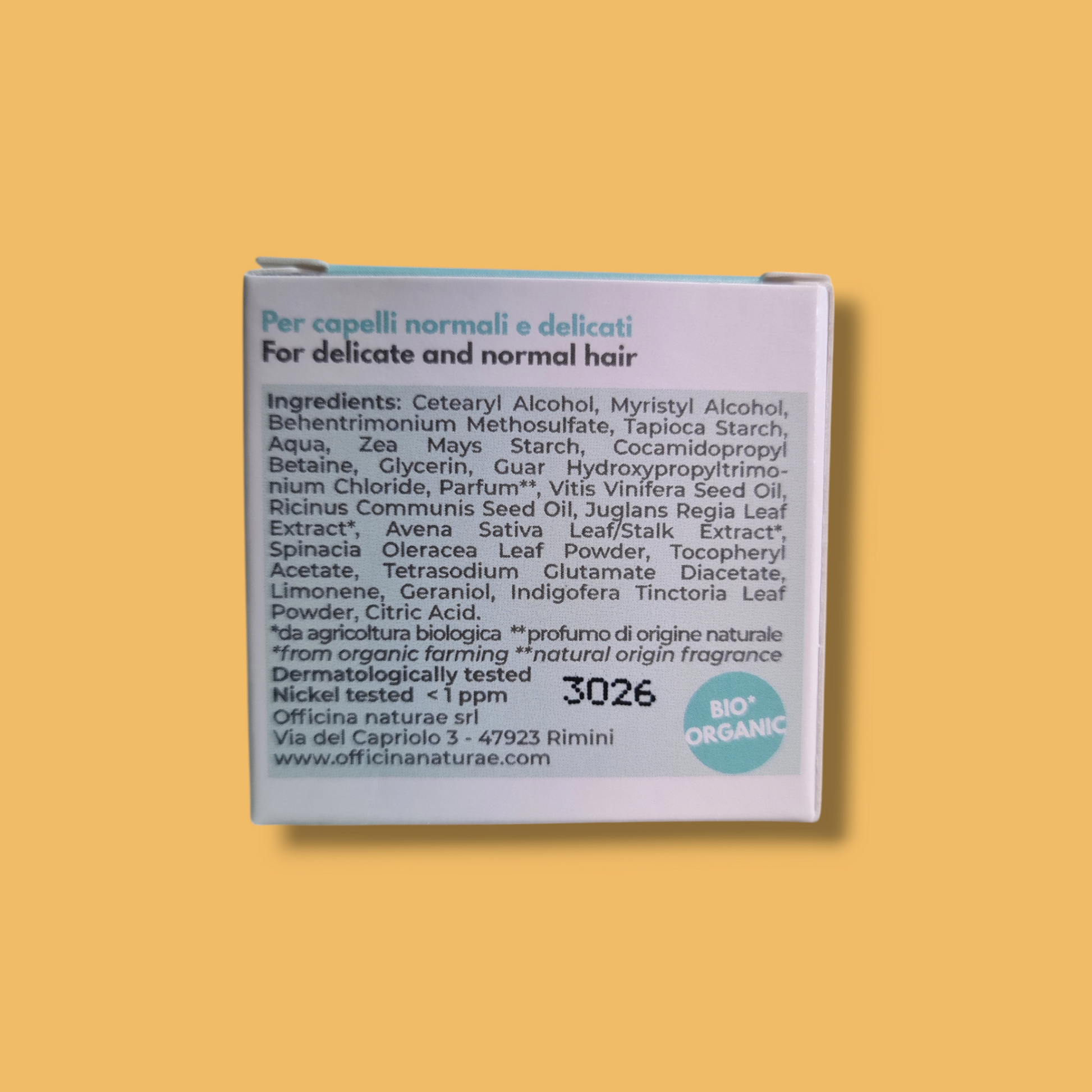 Cetearyl Alcohol, Myristyl Alcohol, Behentrimonium Methosulfate, Tapioca Starch, Aqua, Zea Mays Starch, Cocamidopropyl Betaine, Glycerin, Guar Hydroxypropyltrimonium Chloride, Parfum, Vitis Vinifera Seed Oil, Ricinus Communis Seed Oil, Juglans Regia Leaf Extract*, Avena Sativa Leaf/Stalk Extract*, Spinacia Oleracea Leaf Powder, Tocopheryl Acetate, Tetrasodium Glutamate Diacetate, Limonene, Geraniol, Indigofera Tinctoria Leaf Powder, Citric Acid.