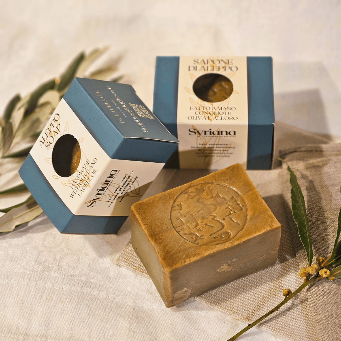 Il sapone di Aleppo è il sapone più antico della storia, fatto solo con olio di oliva e alloro. E’ prodotto unicamente in Medio Oriente per una ragione: poiché non ci sono conservanti, una volta preparato il sapone secondo il metodo secolare, viene essiccato in silos da marzo a settembre. Sopra ogni sapone troverai il nome del produttore pressato a mano.